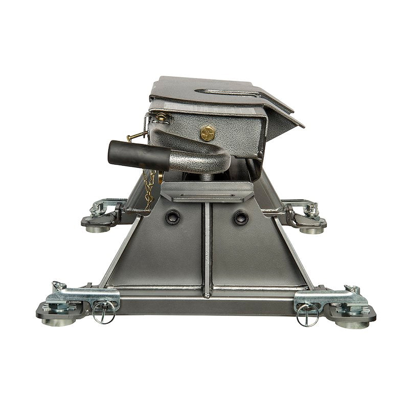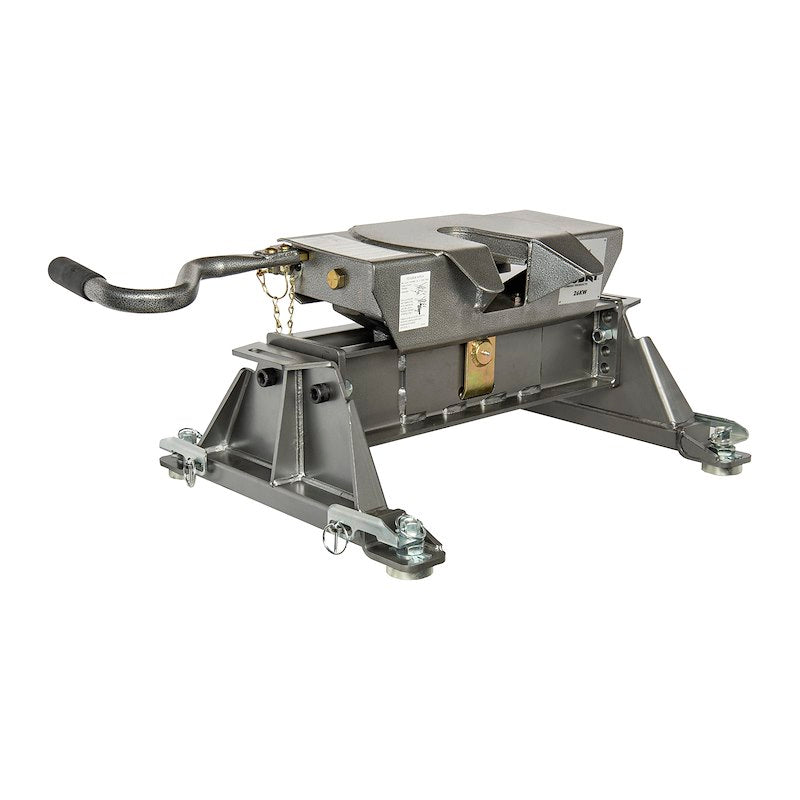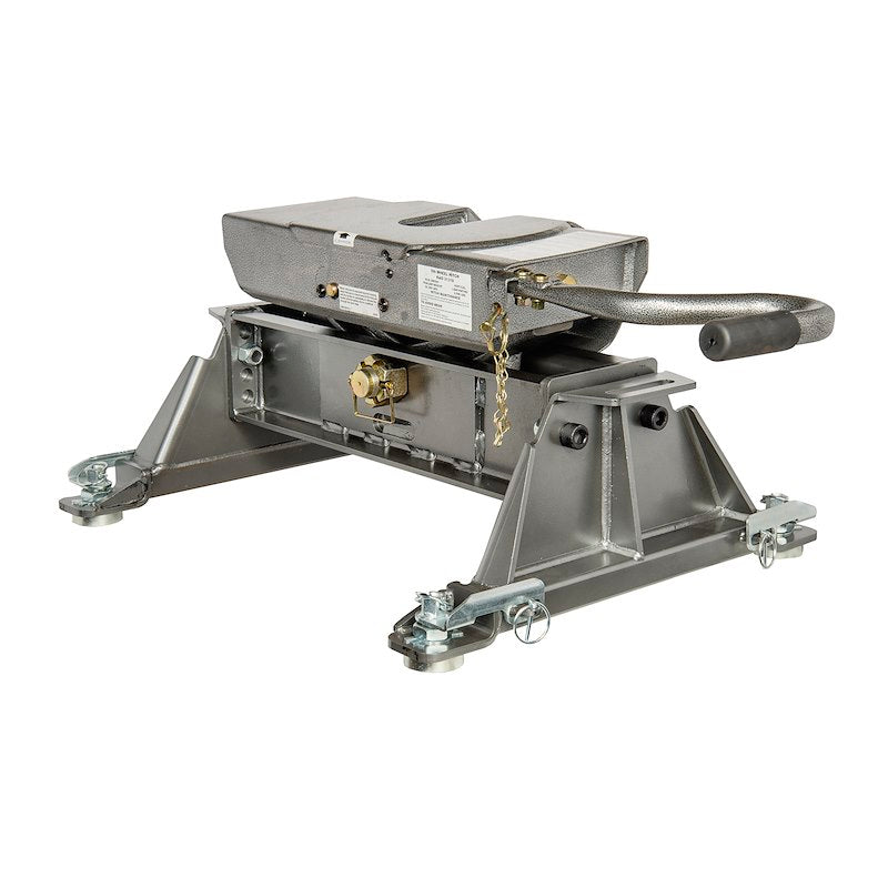 Once on the road, added articulation takes torque twist out of both truck and trailer for a smoother ride and less stress on equipment. A patented anti walk wrap around jaw fully encloses the trailer kingpin. A visible safety indicator shows red when the jaw is open. An automotive OEM quality metallic paint provides a superior finish and gives the 16,000 W and 26,000 W hitches an attractive, rugged look. The 26,000 W can be used with all 5th wheels up to 26,000 Pounds. Meets or exceeds the new SAE fifth wheel test standards.